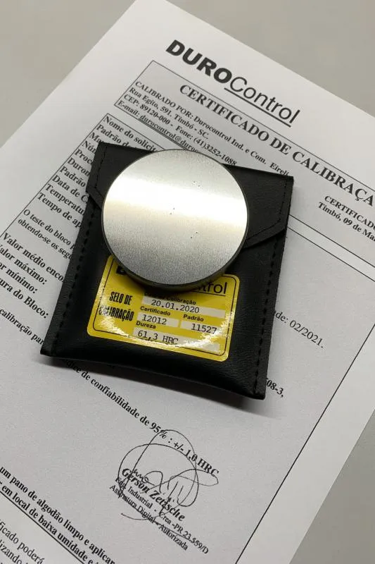 A calibração de bloco padrão de dureza é feita pela Durocontrol, em laboratório adequadamente estruturado, com equipamentos adequados utilizando como referência padrões de dureza primários com procedimentos internos de calibração.