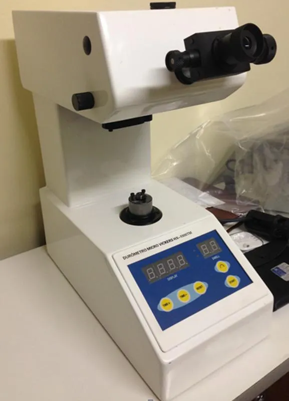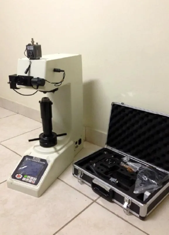A medição de dureza Vickers é realizada através de um durômetro vickers.