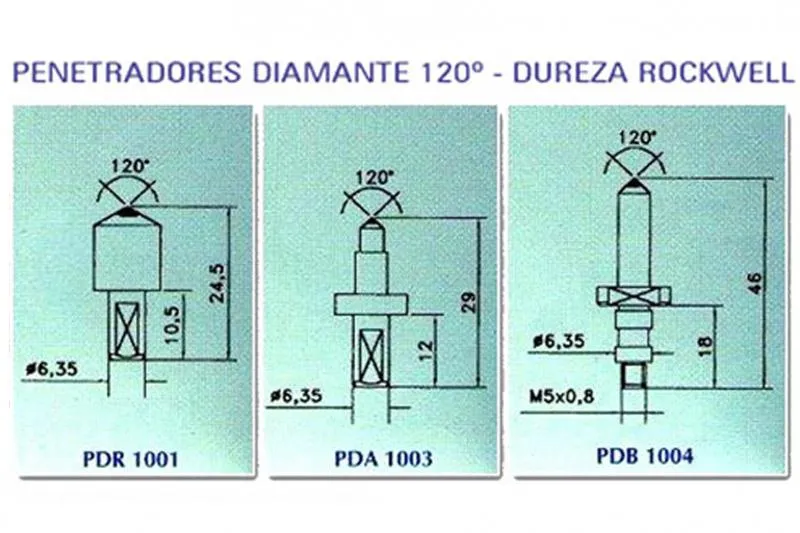 O indentador de diamante Rockwell possui suas características definidas quanto ao ângulo do cone (120°) quanto ao raio da ponta e quanto à sua rugosidade.